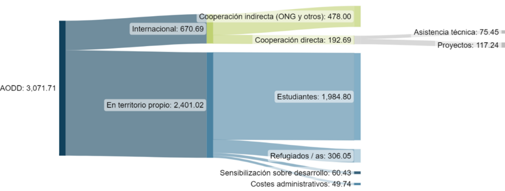 - De este importe, solo el 22% es ayuda transferida efectivamente a otros países y solo el 2,5% es ayuda ejecutada mediante acuerdos de cooperación directa entre Gobiernos subestatales.