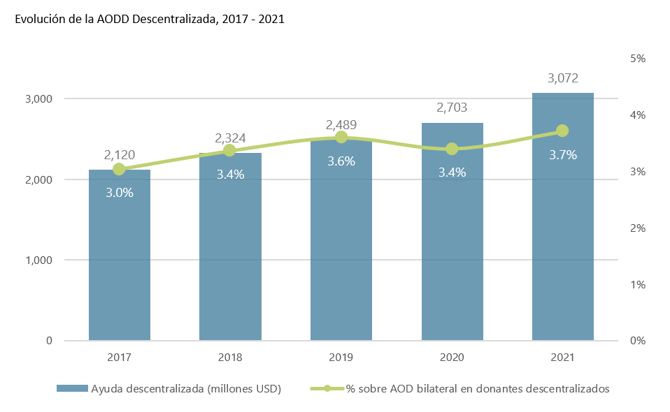 - La ayuda descentralizada sigue creciendo en términos absolutos y relativos. Los últimos datos publicados, correspondientes a 2021, reflejan un crecimiento del 14% y la superación de su techo histórico, situado en 3.000 millones de dólares.
