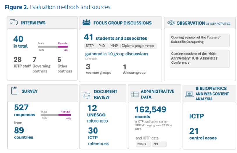 Se empleó un enfoque de métodos mixtos para garantizar una evaluación completa y confiable. Esto incluyó una revisión documental de los documentos del ICTP, dos misiones de campo al ICTP en Trieste, entrevistas semiestructuradas, discusiones en grupos focales y un estudio de seguimiento en línea dirigido a todos los estudiantes y becarios del ICTP desde 2012. El estudio de seguimiento, apoyado por la plataforma en línea Alchemer, recopiló respuestas de 527 participantes, obteniendo una tasa de respuesta del 40%, proporcionando una base de evidencia amplia y participativa.
